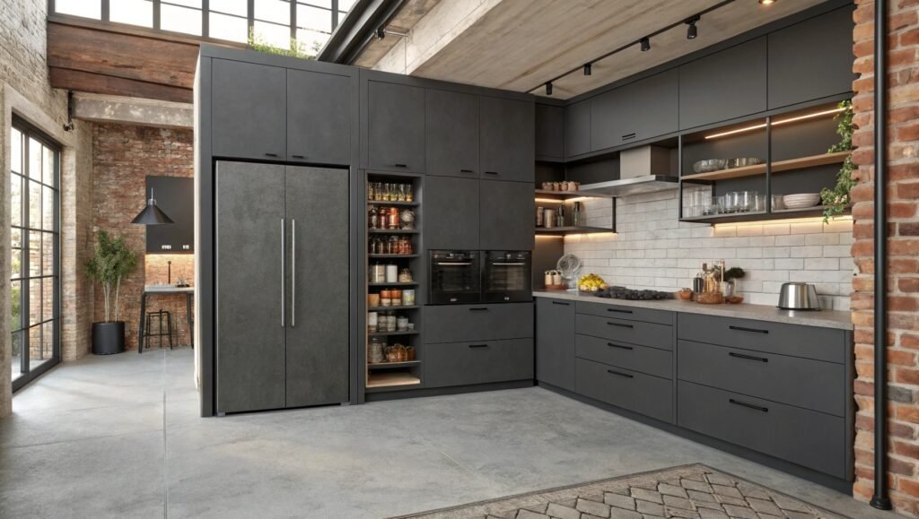 This striking industrial kitchen showcases how pantry storage can seamlessly blend into modern architectural elements. Dark charcoal cabinetry extends floor to ceiling, creating a dramatic backdrop against exposed brick walls and concrete beams. Between the refrigerator units, a tall narrow pantry column provides substantial storage while maintaining the sleek, uninterrupted design flow.