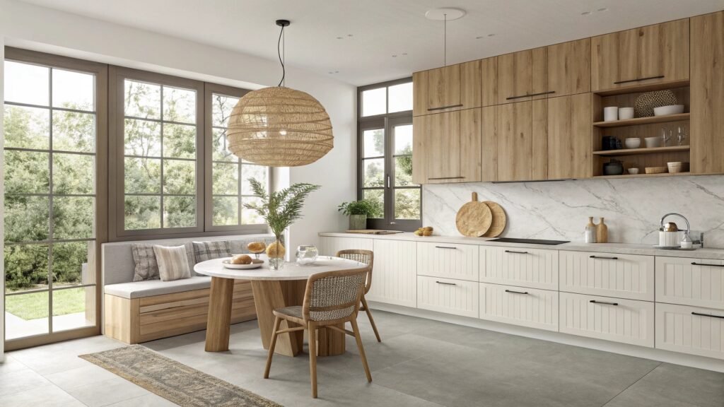 Large windows flood this kitchen with natural light, creating a bright and welcoming space that embodies Japandi design principles. The built-in breakfast nook features a cozy banquette with neutral cushions, inviting family gatherings while maintaining the clean aesthetic. A striking woven pendant light hangs above the dining table, its organic texture adding visual interest without disrupting the serene atmosphere.