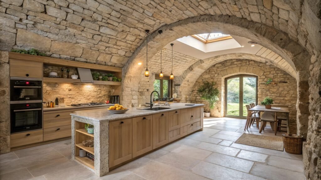 Ancient stone arches create a dramatic cathedral-like atmosphere in this kitchen that masterfully blends historic architecture with Japandi sensibilities. The weathered limestone walls and curved ceiling vaults provide textural richness that speaks to centuries of craftsmanship, while a modern skylight floods the space with natural light from above. Warm oak cabinetry introduces the essential wood element, its clean lines providing contemporary contrast against the rustic masonry.
