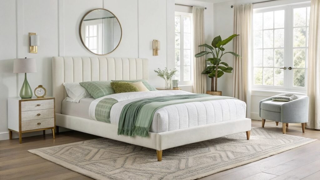 A sophisticated white upholstered bed frame anchors this tranquil bedroom. Its tall headboard features elegant vertical channel tufting, providing a touch of texture and visual interest. Soft white bedding is layered with soothing green and patterned throw pillows, creating an inviting and restful atmosphere. Subtle gold accents on the bed frame legs and nightstand handles add a hint of understated glamour.