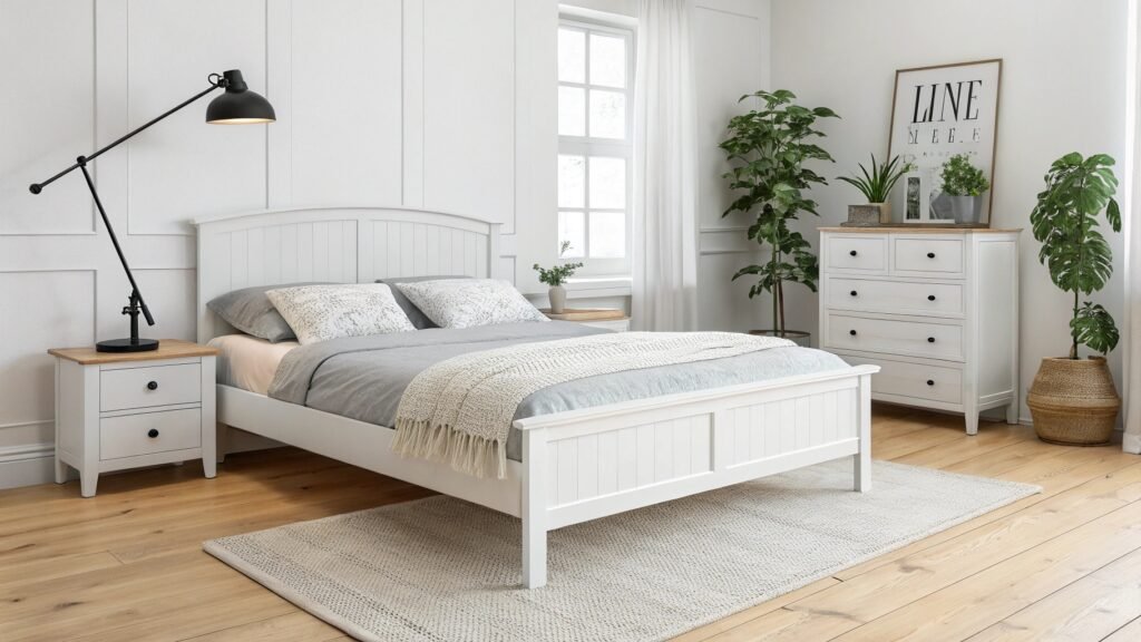 Several potted plants bring a refreshing touch of greenery indoors, enhancing the room’s connection to nature. A light-colored woven rug anchors the bed, adding texture and softness to the wooden floor. This scene demonstrates how a white plank bed frame can create a magnetic and comforting dream retreat, blending rustic charm with a sense of peaceful simplicity.