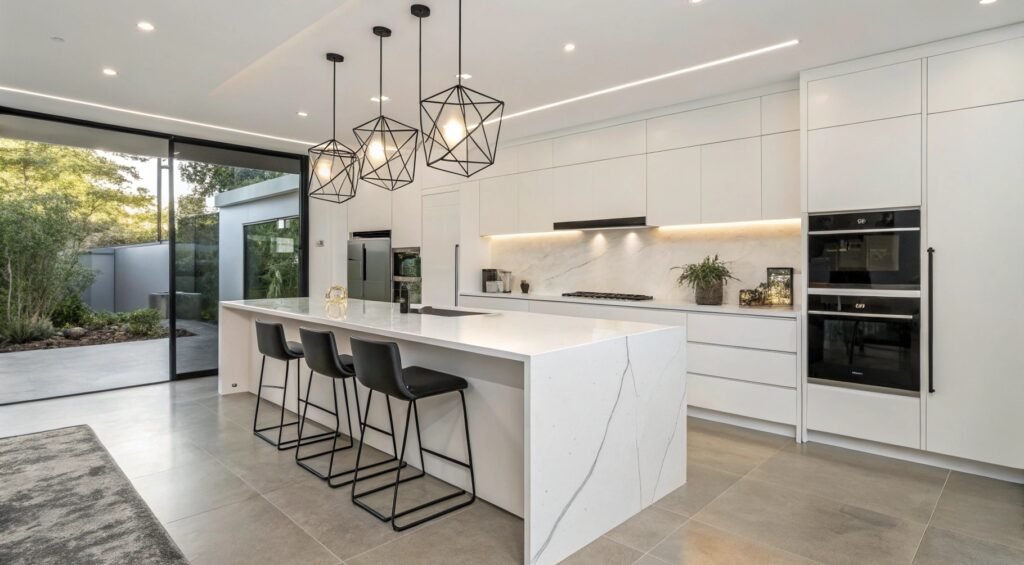 The kitchen’s color palette relies on a harmonious blend of whites and grays, with sleek handleless cabinetry extending along the perimeter walls. Under-cabinet LED lighting illuminates the marble backsplash, creating a warm ambient glow that enhances the stone’s natural veining. Black bar stools with minimalist metal frames provide seating at the island, their dark finish echoing the pendant lights above.