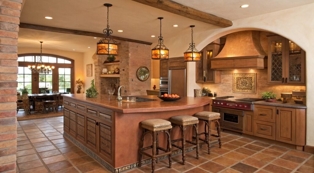 Old World craftsmanship meets southwestern luxury in this magnificent kitchen featuring a massive island wrapped in warm adobe tones and intricate hand-painted tile work. Rich copper countertops develop a natural patina over time, creating living surfaces that grow more beautiful with age. Three amber glass pendant lights with wrought iron details cast warm, golden illumination that enhances the earthy color palette throughout the space.