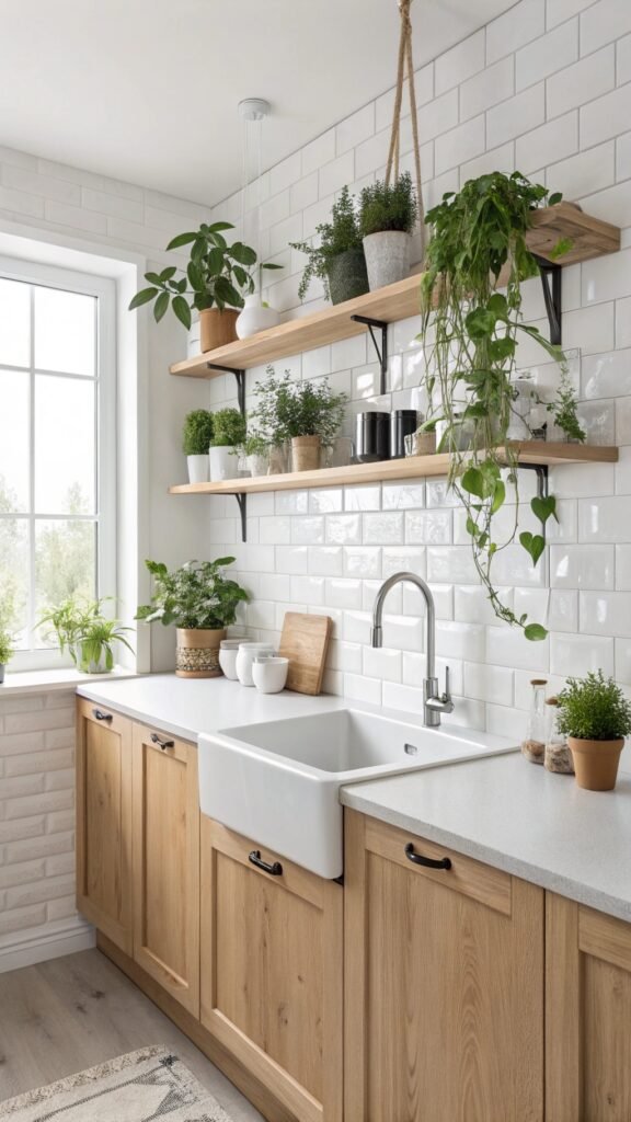 This fresh kitchen demonstrates how abundant greenery can transform the sink area into a thriving indoor garden. Two floating wood shelves provide multiple levels for displaying potted herbs, trailing plants, and small houseplants that bring natural beauty to the cooking space. A macrame hanging planter adds vertical interest while showcasing cascading vines that soften the clean lines of the white subway tile backsplash.