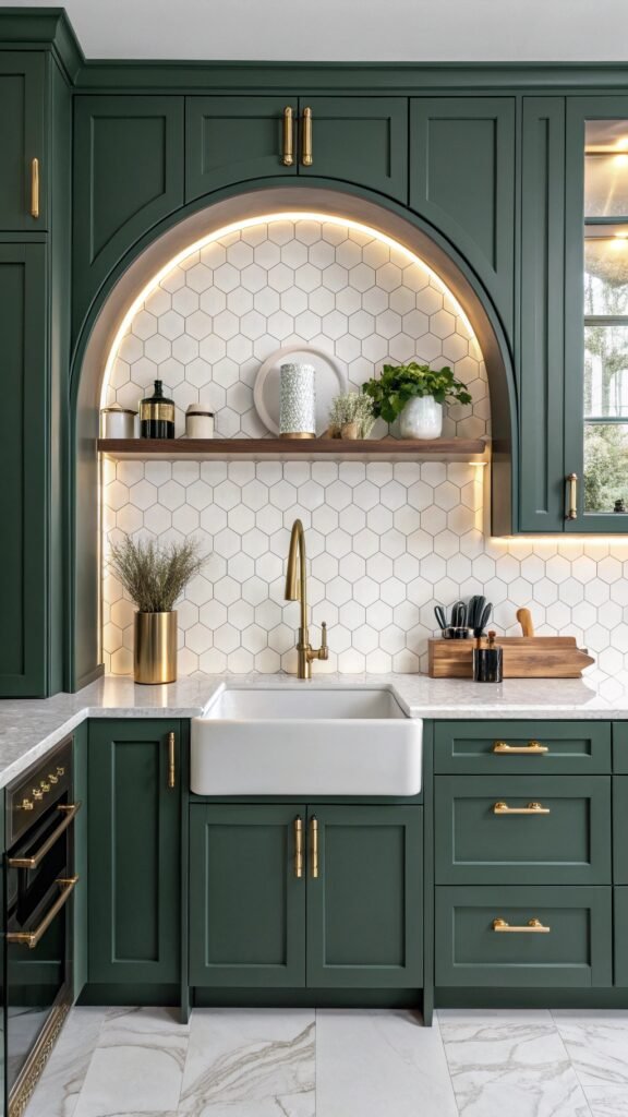 This sophisticated kitchen features a stunning arched alcove that transforms the sink area into an architectural focal point. Built directly into the deep green cabinetry, the curved opening creates a dramatic frame for white hexagonal tiles and integrated LED lighting. A floating wooden shelf spans the width of the arch, providing elegant storage for decorative vessels, small plants, and everyday essentials while maintaining clean lines.