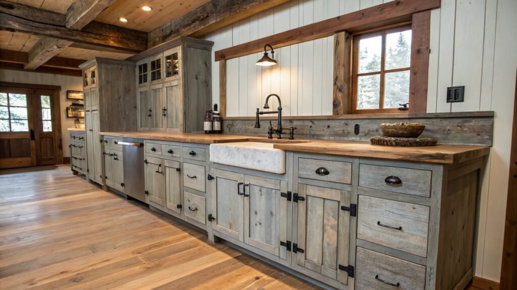 Distressed wood cabinetry brings authentic mountain lodge character to this stunning rustic kitchen design. Gray-washed oak showcases natural weathering and character marks that tell stories of age and craftsmanship, creating genuine charm throughout the space. The muted gray tones provide sophisticated warmth while maintaining the organic, lived-in feel that defines authentic rustic style.